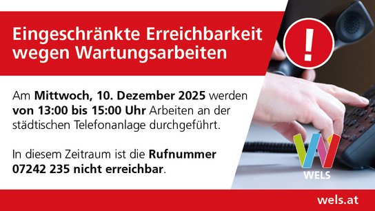 Am Mittwoch, 10. Dezember 2025 werden von 13:00 bis 15:00 Uhr Arbeiten an der städtischen Telefonanlage durchgeführt.
