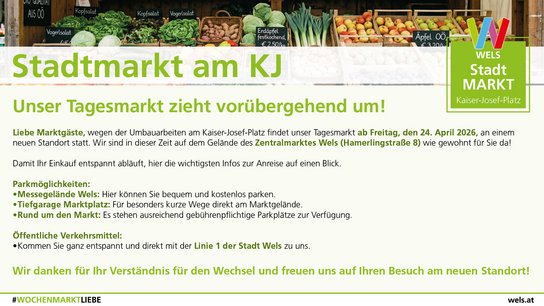 Aufgrund der Umbauarbeiten am Kaiser-Josef-Platz wird der Tagesmarkt ab Freitag, 24. April auf Zentralmarktgelände verlegt.