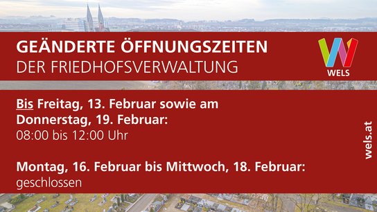 Aktuell gelten bis einschließlich Donnerstag, 19. Februar geänderte Öffnungszeiten in der Friedhofsverwaltung. Bitte um Beachtung!