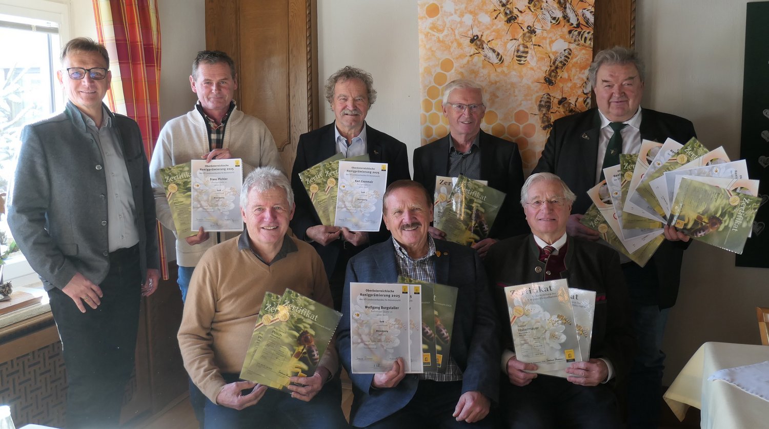 Bei der Jahreshauptversammlung des Welser Imkervereins prĂ€sentierten die Welser Imker ihre QualitĂ€tsauszeichnungen, die sie vom Labor des Oberösterreichischen LandesbienenzĂŒchtervereins bekommen haben. Dabei wurde der Honig nicht nur chemisch untersucht, sondern auch auf pH-Wert, HMF-Bestimmung, Wassergehalt etc. kontrolliert. Insgesamt wurden 17 QualitĂ€tszertifikate von den Welser Imkern errungen. Welser Honigkunden können daher mit höchster QualitĂ€t rechnen, wenn sie direkt beim Imker Honig kaufen. ZusĂ€tzlich haben auch noch Obmann Wolfgang Burgstaller, Franz Pichler, Franz Berger und Karl Zaunmair an der Oberösterreichischen HonigprĂ€mierung 2025 teilgenommen und bekamen dabei insgesamt sieben Goldauszeichnungen. VizebĂŒrgermeister Mag. Klaus Schinninger â der selbst Imker ist â und Stadtrat Thomas Rammerstorfer als zustĂ€ndiger Referent gratulierten den Ausgezeichneten zu deren groĂartigen Erfolgen und bedankten sich zusĂ€tzlich fĂŒr die Arbeit, die der Welser Imkerverein das ganze Jahr fĂŒr die Bevölkerung der Stadt Wels leistet. Weitere Infos zum Verein sind unter www.welser-imker.at im Internet zu finden.