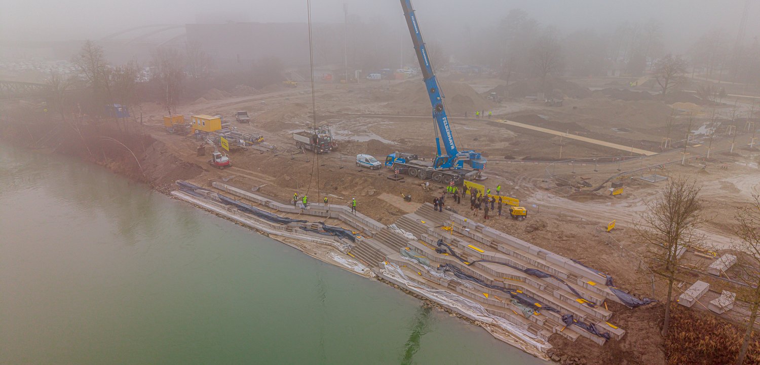 Mit der Welser Bucht entsteht â wie bereits berichtet â ein attraktiver Aufenthalts- und Begegnungsraum direkt am Fluss. Sie wird insgesamt 75 Meter lang und 15 Meter breit sein. Zusammengerechnet ergeben die 127 einzelnen Betonfertigteile ein Gesamtvolumen von rund 98,5 Kubikmeter Beton mit einem Gesamtgewicht von rund 259 Tonnen. Die Betonsitzstufen werden einen freien Blick auf die Traun und den direkten Kontakt zum Fluss ermöglichen und auf diese Weise die Besucher zum Verweilen, Sonnenbaden und Erleben einladen.