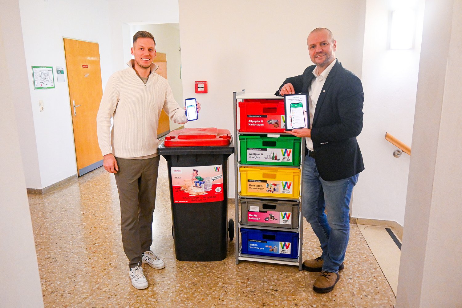 Stadtrat Thomas Rammerstorfer und der stĂ€dtische Abfallbeauftragte Lukas AitzetmĂŒller prĂ€sentieren die ab 2026 auch fĂŒr Wels-Stadt nutzbare App âAbfall OĂâ.