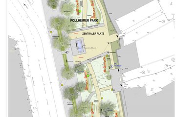 Auch entlang der Wege wird der Park mit neuen Sitzgelegenheiten ausgestattet. Als weitere Highlights dienen Blumenbeete mit Wechselflor und Staudenschmuckbeete, die dem Pollheimerpark ein besonderes Flair geben werden. Der Baumbestand im Park wird erhalten und um drei neue BÀume entlang der Promenade ergÀnzt.