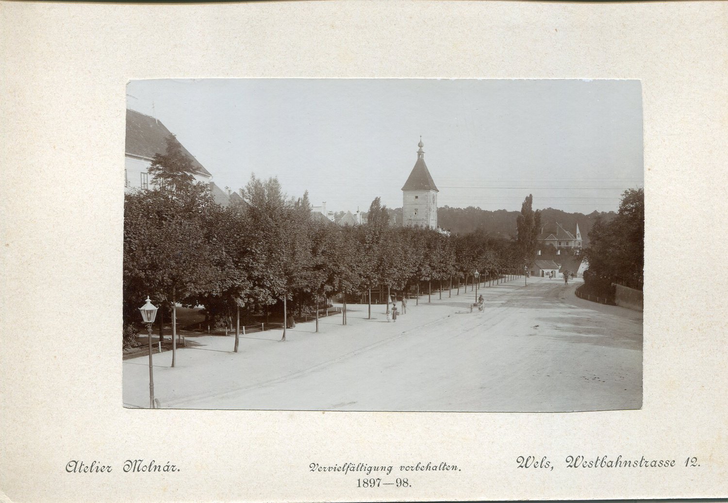 Im Zuge der AuffĂŒllung des Stadtgrabens und der Errichtung der RingstraĂe kam es bereits im Jahr 1882 zur Anpflanzung von BĂ€umen auf dem von der Stadtgemeinde regulierten Platz vor dem Schloss Polheim durch den Welser Verschönerungsverein. 1887 genehmigte die Stadt eine Gartenanlage, die nach den PlĂ€nen von BĂŒrgermeister Dr. Johann Schauer gestaltet wurde und 1889 den Namen âPolheimer Anlageâ bekam. Der Park erhielt dem Zeitgeschmack entsprechend geschwungene Wege und Rondeaus. Auch ein âKindertummelplatzâ wurde errichtet. Eine durchgehend vorgesetzte Baumreihe umgab den Platz, wobei Richtung PollheimerstraĂe nochmals ein breiter Gehweg vorgelagert wurde.