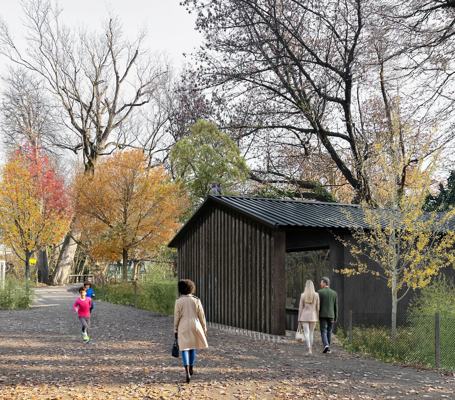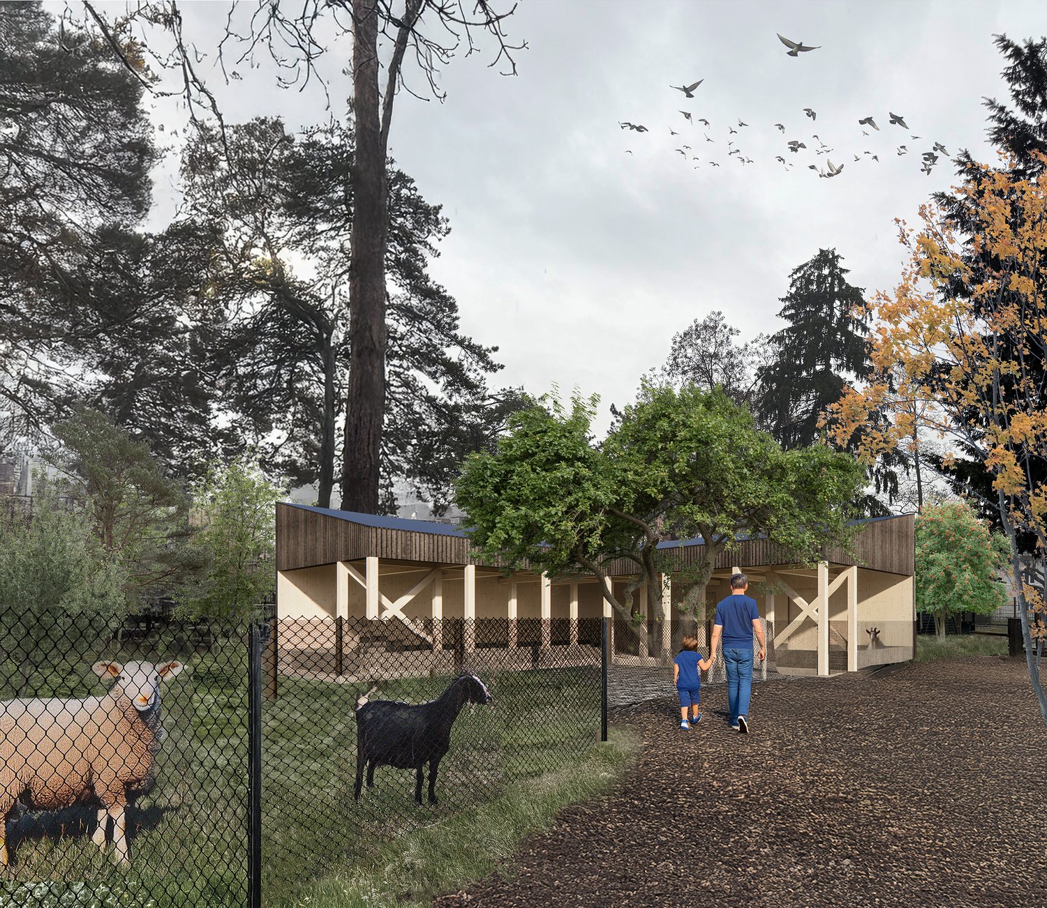Entstehen soll ein Offenfrontstall mit Bauernhof-Ambiente: Unter einem Vordach besteht ein guter Einblick in die Stallbuchten der Kunekune Schweine, Tauernscheckenziegen und Ouessant-Schafe. Letztere können kĂŒnftig mit den Besuchern in einer Begegnungszone auf TuchfĂŒhlung gehen. Die Kaninchen bleiben von den Besuchern getrennt, eine FĂŒtterung mit Gras beziehungsweise Heu durch die Abtrennung wird möglich sein. Eine Stallbucht ist fĂŒr die GĂ€ste nutzbar und bietet einen Ort unter Dach fĂŒr KinderfĂŒhrungen bei Schlechtwetter. Die Zackelschafe kommen in den Osten des Bereiches, die Appenzeller SpitzhaubenhĂŒhner dĂŒrfen frei herumlaufen. Die Begegnungszone und die Koppeln erhalten zusĂ€tzliche teils blĂŒhende BĂ€ume und die FreiflĂ€che einen kleinen Blumen-Bauerngarten.