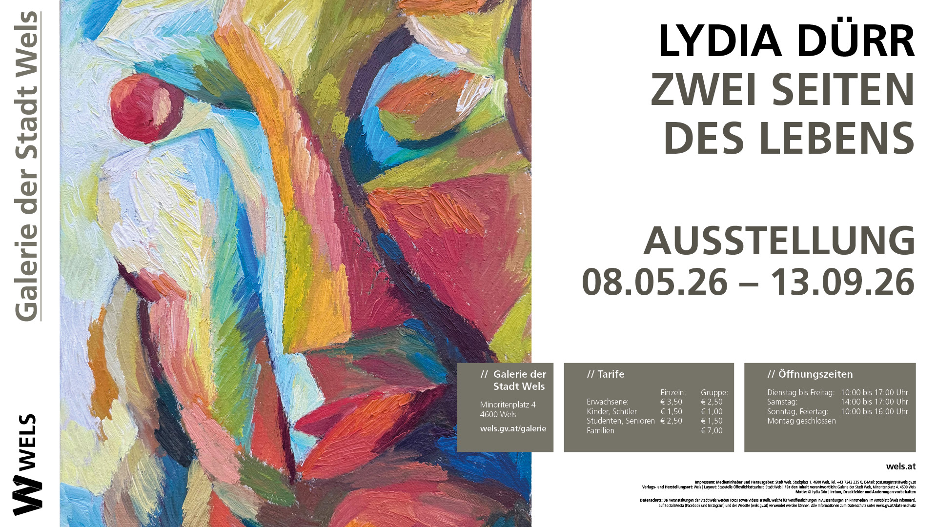 Lydia DĂŒrr hat von 1981 bis 1987 ihr Studium an der Akademie der bildenden KĂŒnste in Wien in den Klassen von Prof. Eckert und Prof. Prachensky absolviert. Die Galerie der Stadt Wels zeigt einen Auszug aus ihrem Werk der letzteren Jahre kombiniert mit einigen expressiven frĂŒheren Werken, in denen in ĂŒberhöhter Farbigkeit die Ă€uĂere Erscheinung von Dingen beschrieben ist.