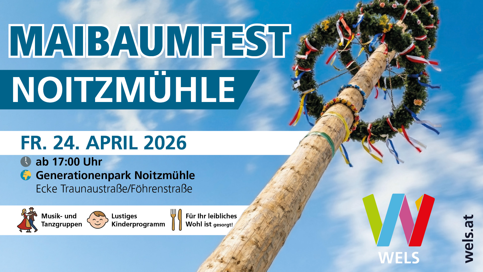 Das Maibaumfest im Generationenpark Noitzmühle (Ecke Traunaustraße/Föhrenstraße) findet heuer am Freitag, 24. April ab 17:00 Uhr statt. Musikalische und tänzerische Einlagen kommen vom Eisenbahnermusikverein Wels, der Tanzgruppe des serbischen Vereins „Kud Bosiljak Wels“ sowie von der Expositur der städtischen Kinderbildungs- und -betreuungseinrichtung Noitzmühle.